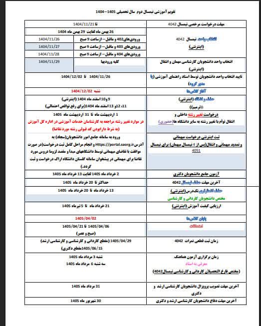 تقويم آموزشي نيمسال دوم سال تحصيلي 1404-1405